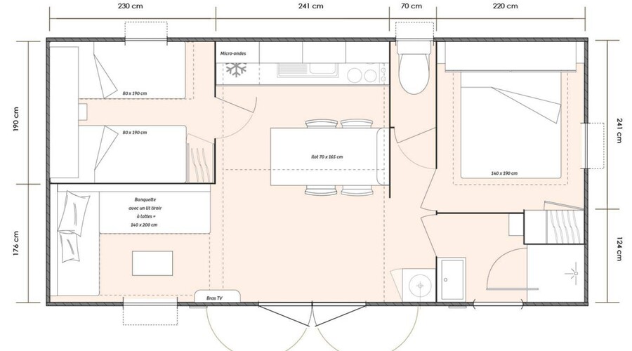 - 3 chambres avec deux lits de 70x190 cm OU, selon version, 1 chambre avec deux lits superposés de 70x190 cm et 2 chambres avec deux lits de 70x190 cm,